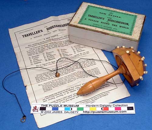 An original copy of Sir William Rowan Hamilton's famous "Icosian Game". There are only three other known examples of this puzzle. Sir William Rowan Hamilton, who was Astronomer Royal of Ireland, invented the puzzle in 1857. He sold the rights to Jaques for £25. Hamilton gave his name to the mathematical field of "Hamiltonian Circuits". The pieces are conical bone or ivory plugs. The puzzle museum only has a photocopy copy of the original rules, which give 15 example puzzles. Hamilton intended that one person should pose the puzzle and a second person solve it.