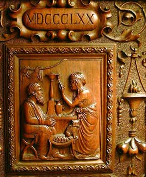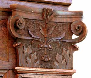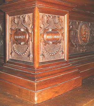 The base of each of the corner columns has two cartouches carved with words in Latin. The eight inscriptions make up the sentence: QVAE MIHI CREDIDERIS SERABABO FIDELITER NEC QVISQVAM ERIPIET NICI PRIVIS CONFRECERIT: This slightly obscure Latin translates as 'Whatever you will have entrusted to me I will guard faithfully and nobody can take unless he shall have first solved it'. So with this challenge, we know that this cabinet was truly designed to be a puzzle. The plinth is carved