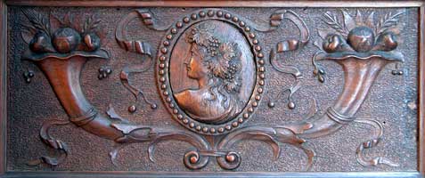 Each side has a central carved tablet with scenes of fertility and plenty. The four corners are similarly decorated uprights with Corinthian capitals, above an inverted breakfront frieze, all carved with foliate and floral sprays, fruit, classical scenes and portrait medallions  |