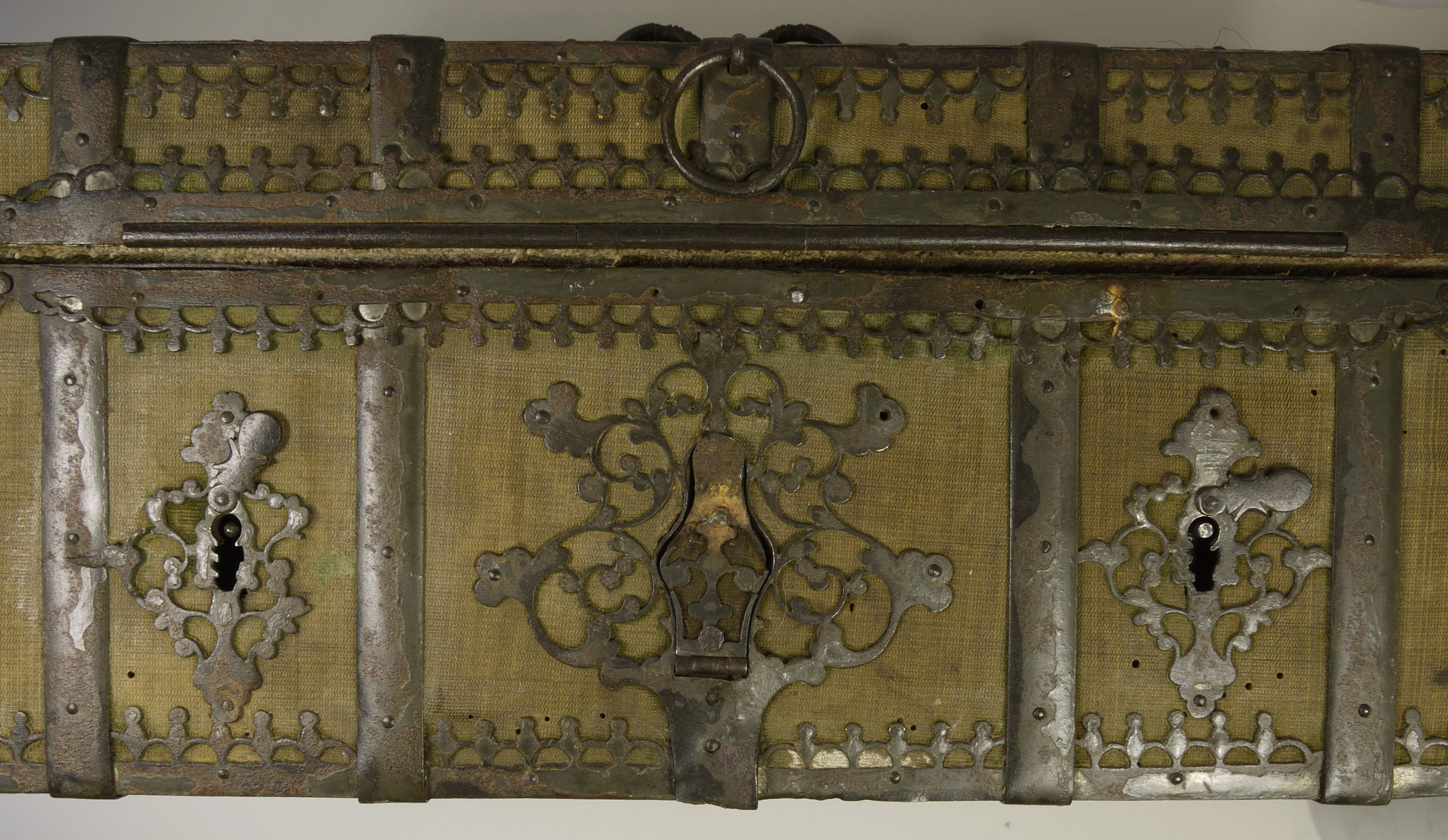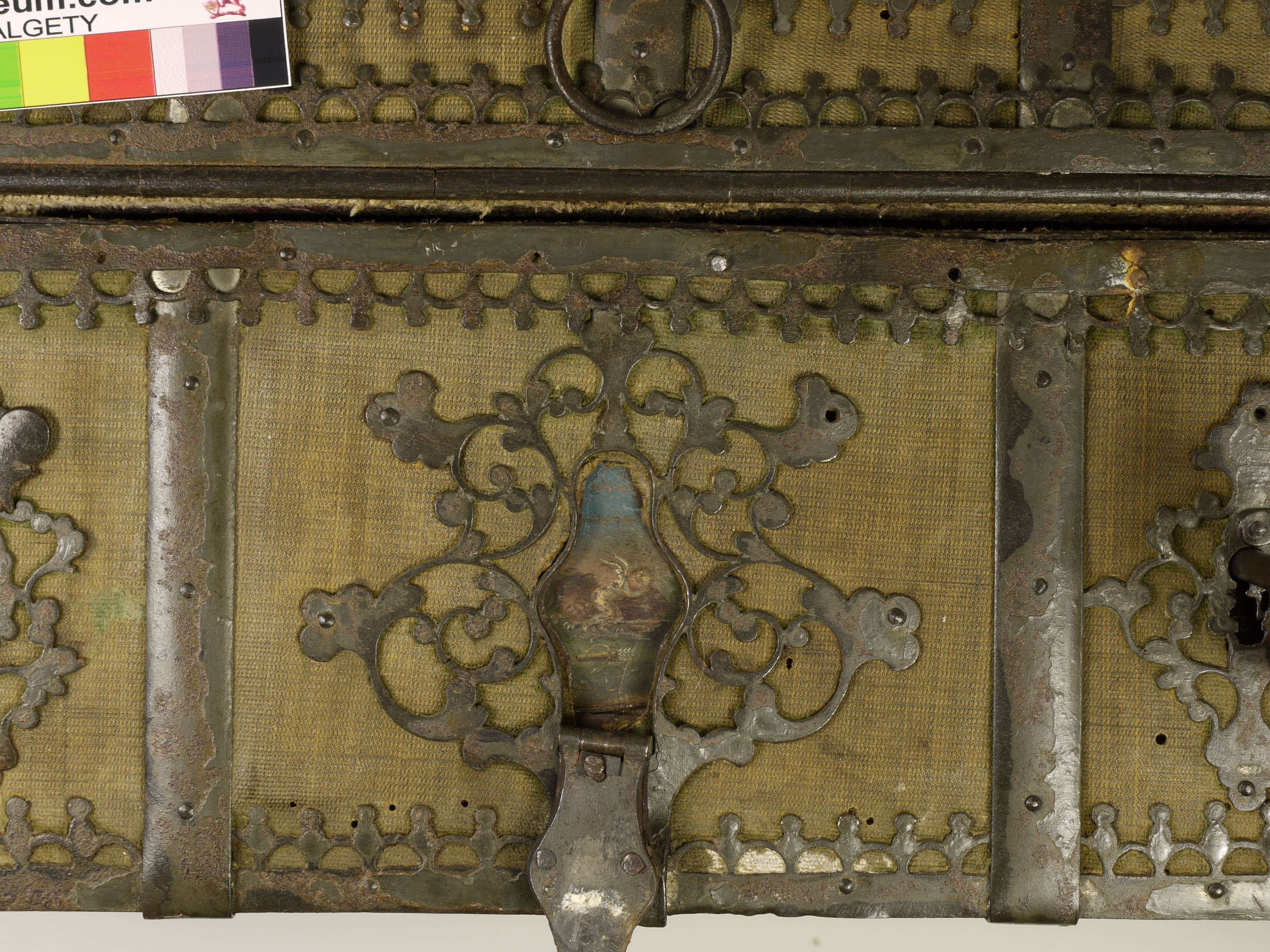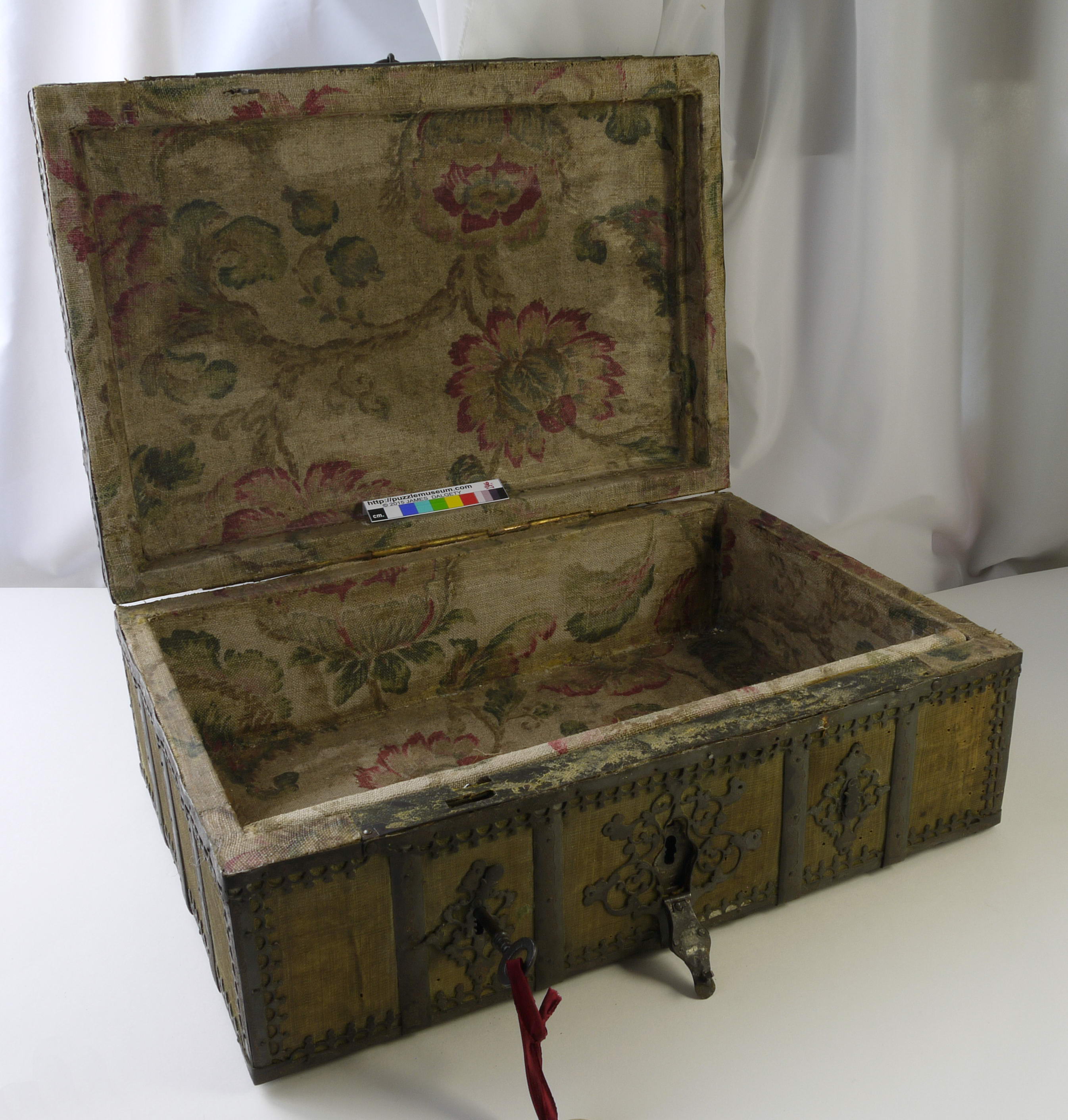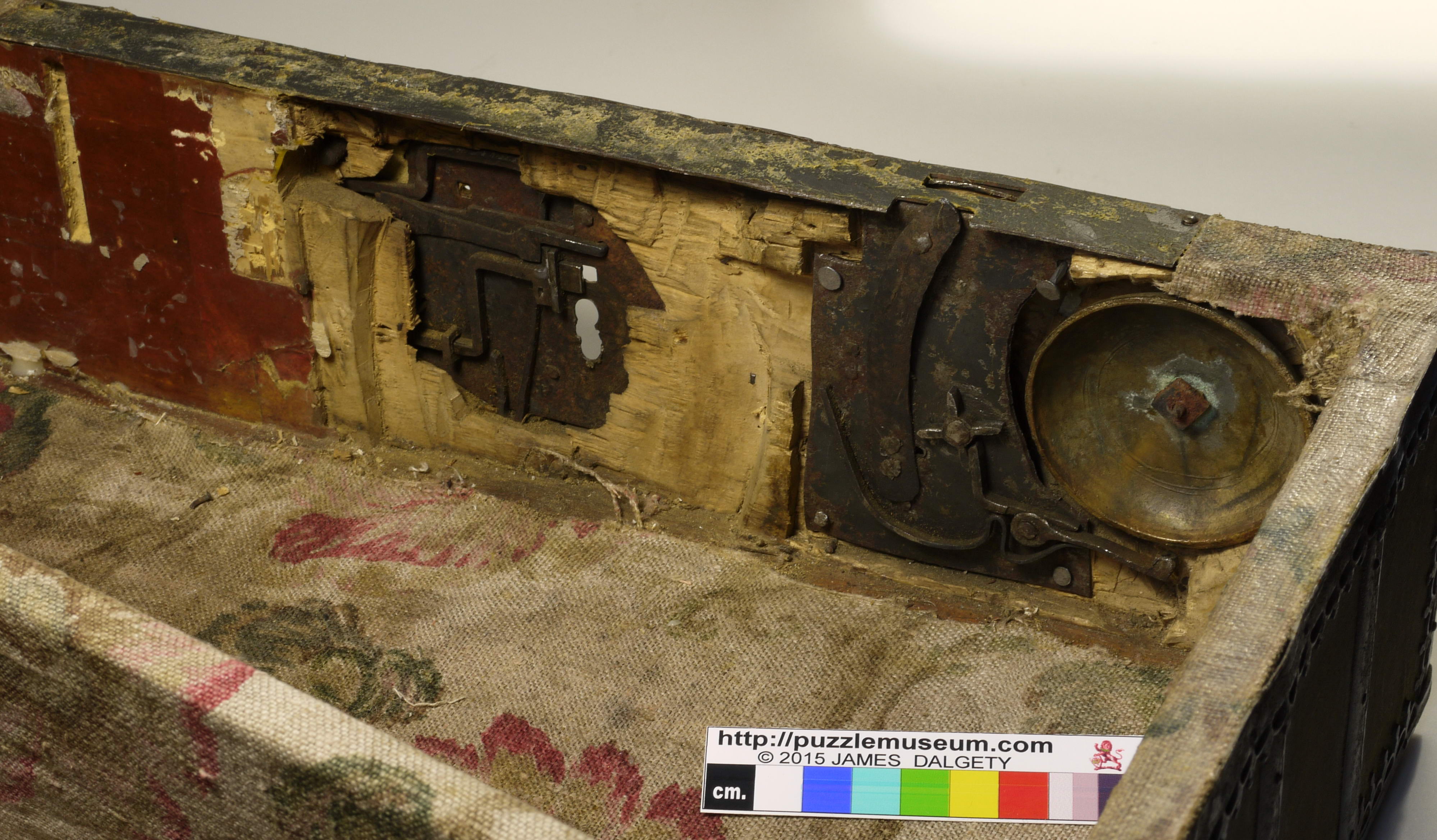 CUPID & LION CASKETThis cloth covered steel bound pine casket has suffered over the centuries; however it is of great puzzle interest as it incorporates an alarm, tricks, and puzzles. It measures 410 x 285 x 180 mm. The outside appears to be an authentic 17th Century or earlier steel-bound cloth covered wooden casket. On the back of the casket there are two dummy keyhole covers. On the front there are two keyholes with swivelling covers and a locked central drop down cover. At some time in the 20th Century the interior has been extensively "restored", presumably to make it more saleable, and it has been lined with a printed linen cloth. However the panel behind the locks has been intelligently constructed of balsa wood covered in the same fabric. This makes it easy to remove to reveal the surviving parts of the locking mechanism.  |