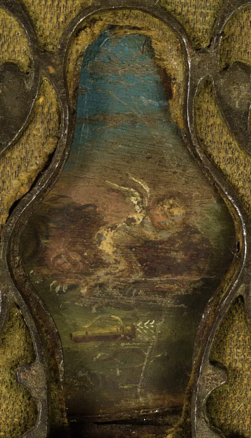 | This panel has a painting on it, sadly rather scratched, which shows a sleeping Cupid lying asleep on a Lion skin with Hercules' quiver of arrows neaby. | |
