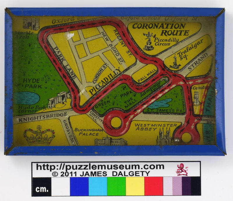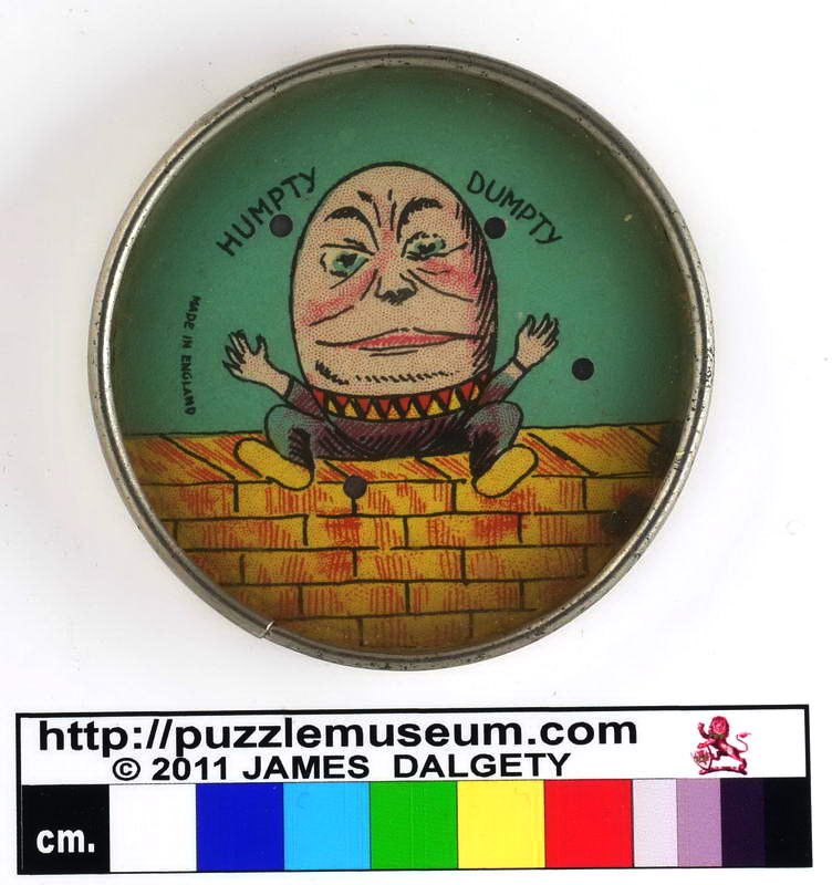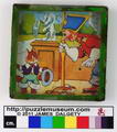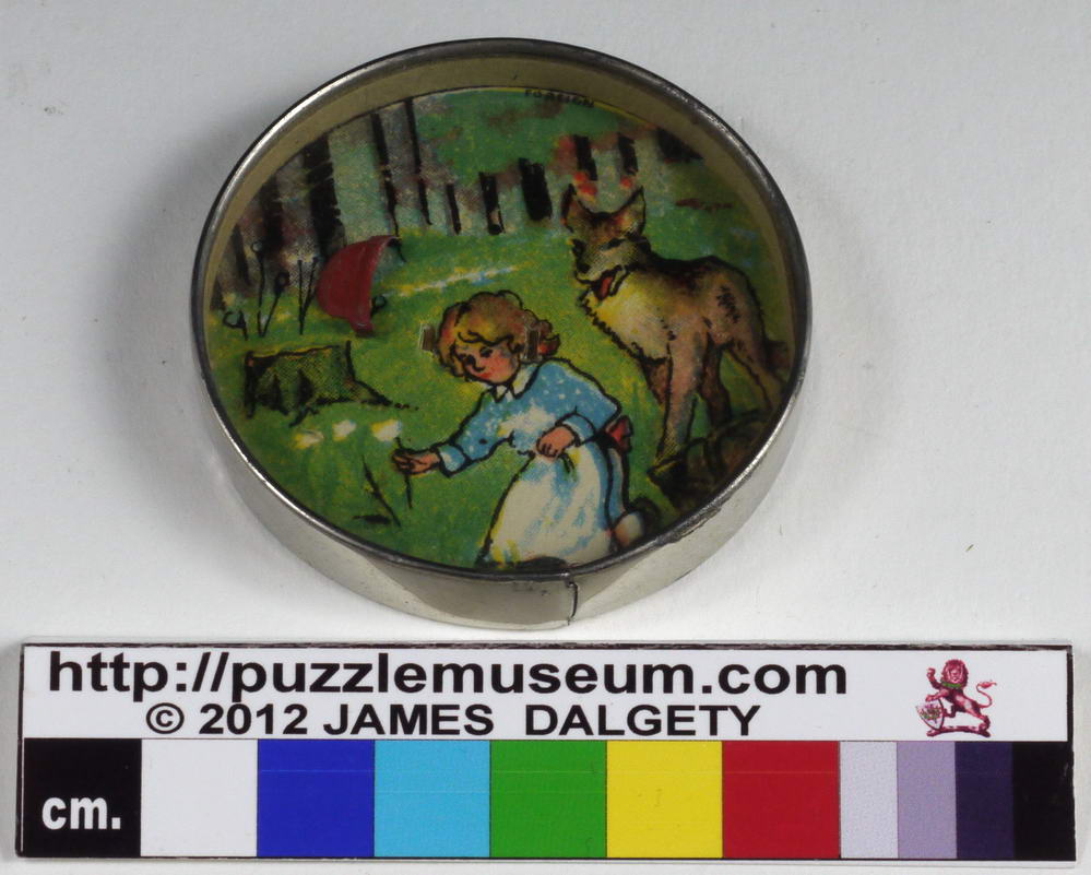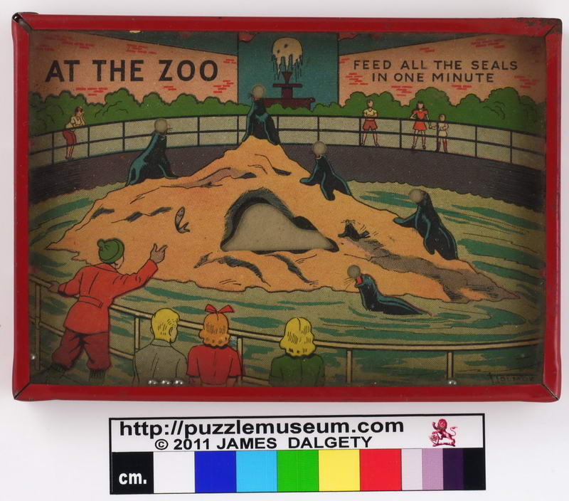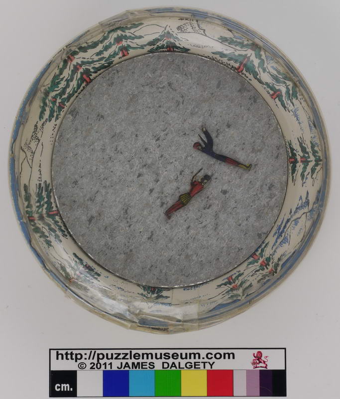 The central puzzle approached up a ramp is lithographed tin image of Studdy's Bonzo dog. 1920s |