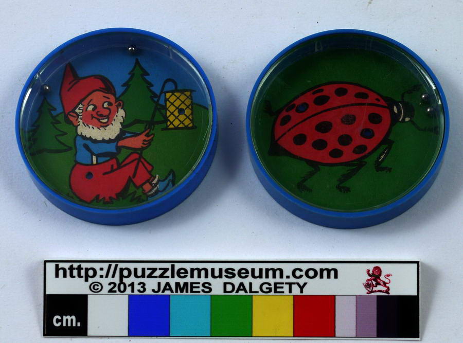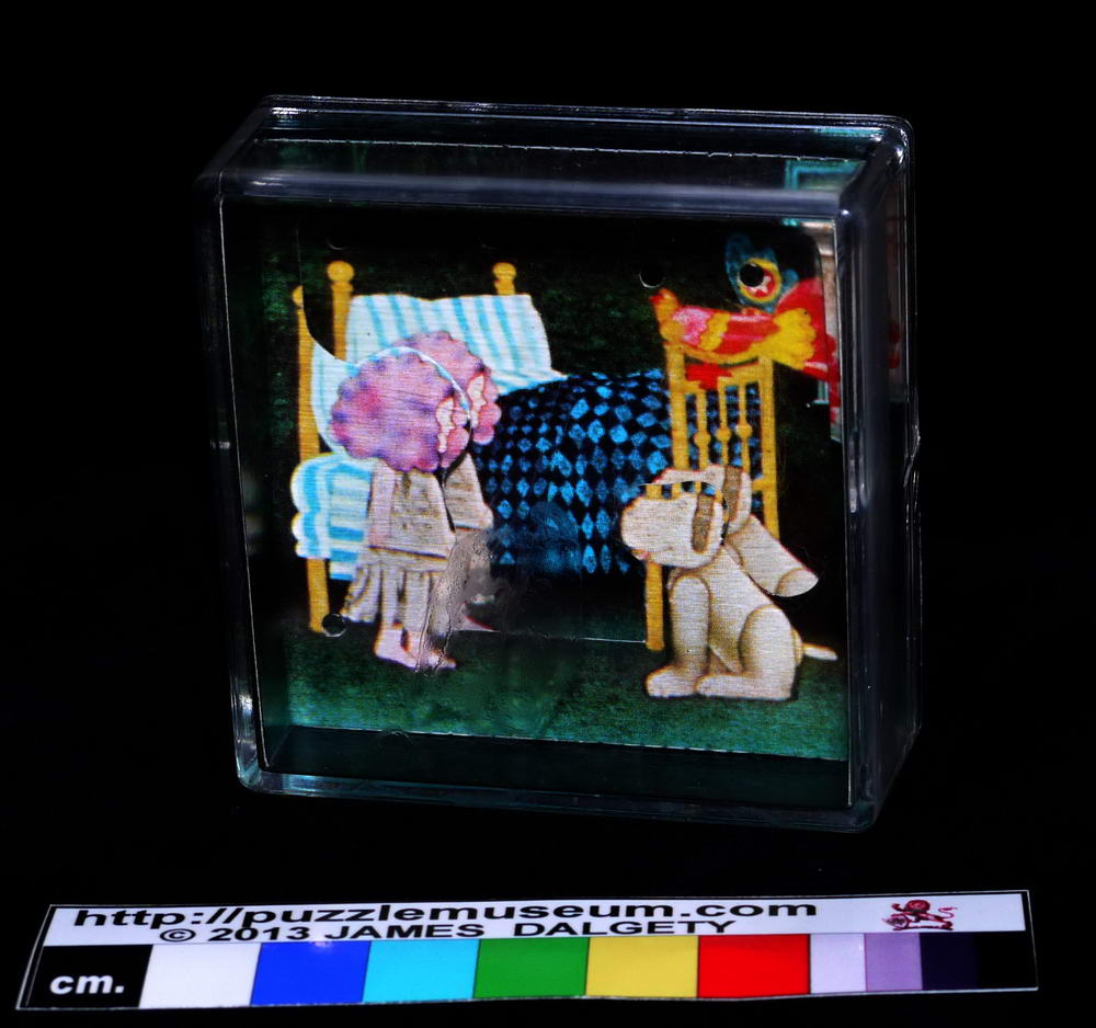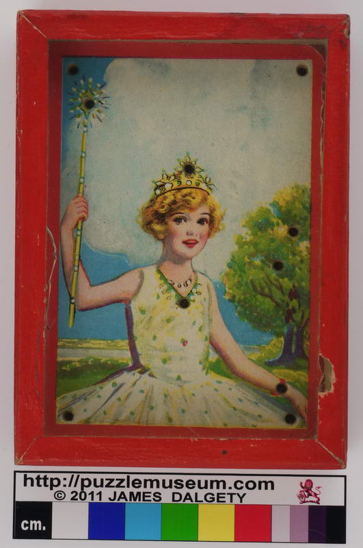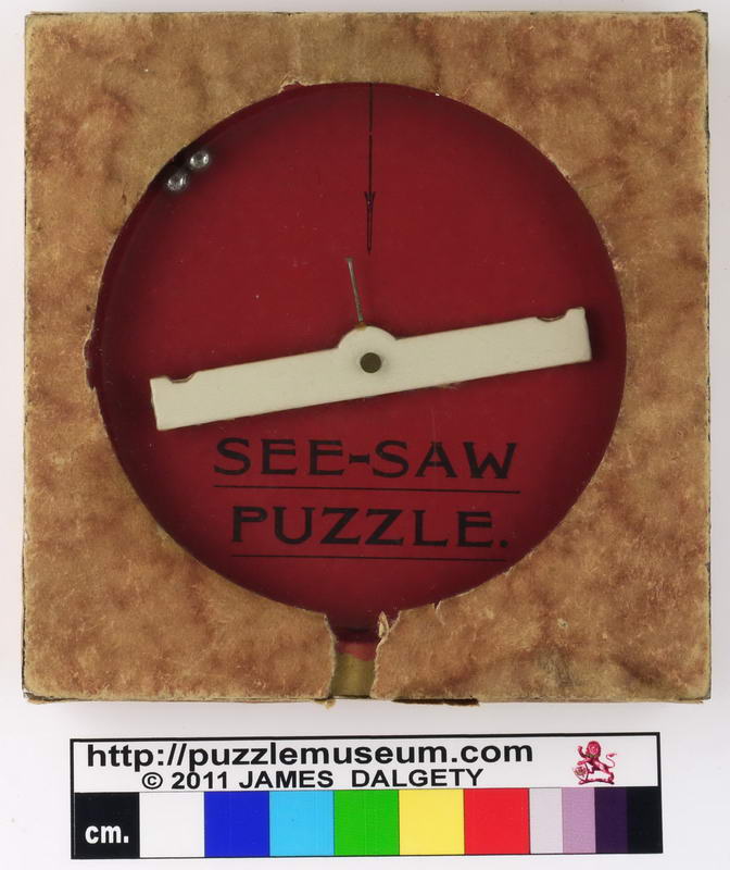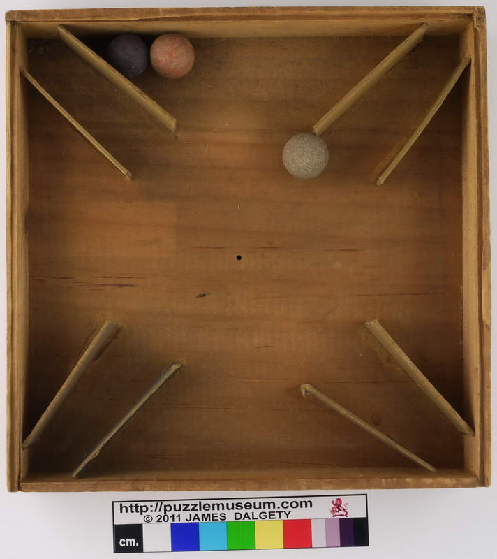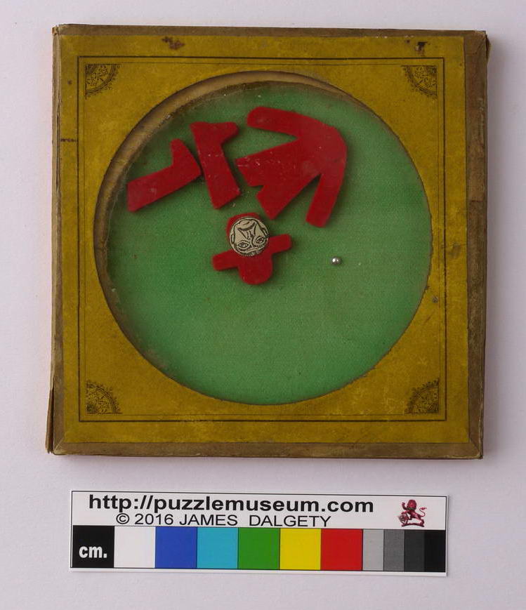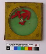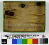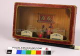 TWIN BEDS. A great and unusual dexterity. Unusual for any dexterity, the puzzle has to end up on edge with the correct weighted celluloid dolls lying down in the correct beds. Needs brains as well as dexterity. Made c1930 by Wilder Mfg.Co. USA (dup of N286) |