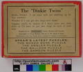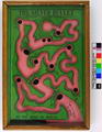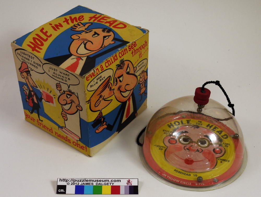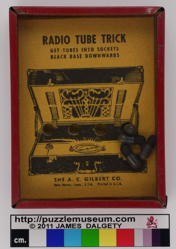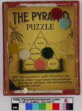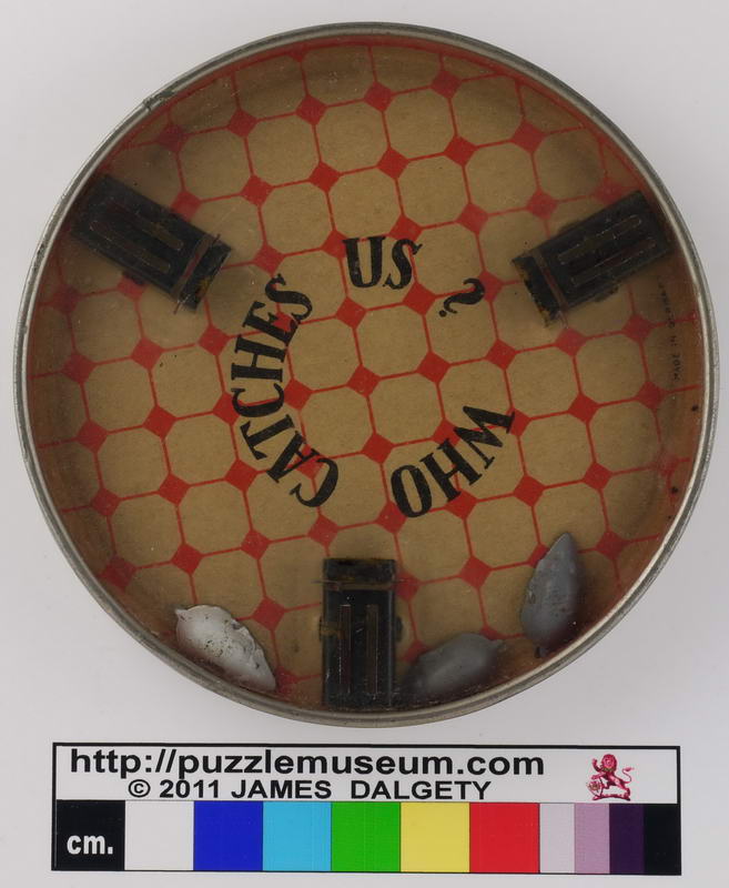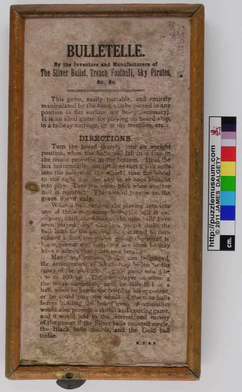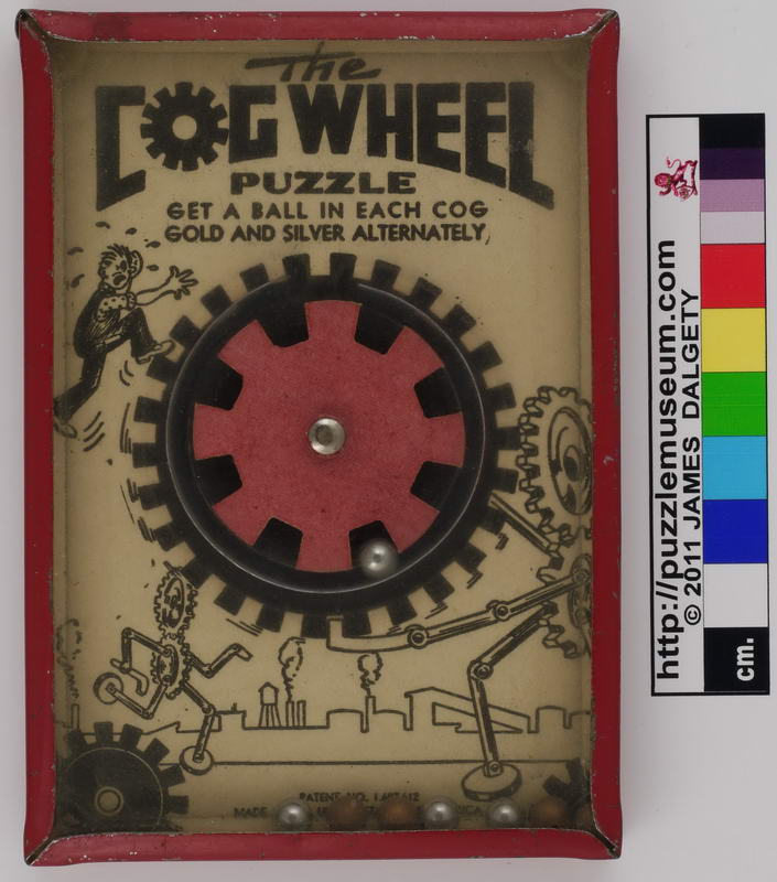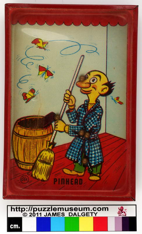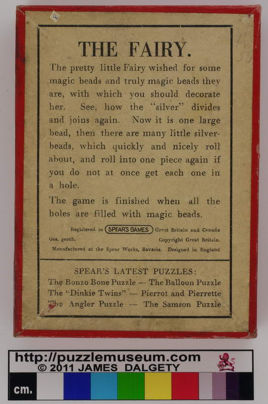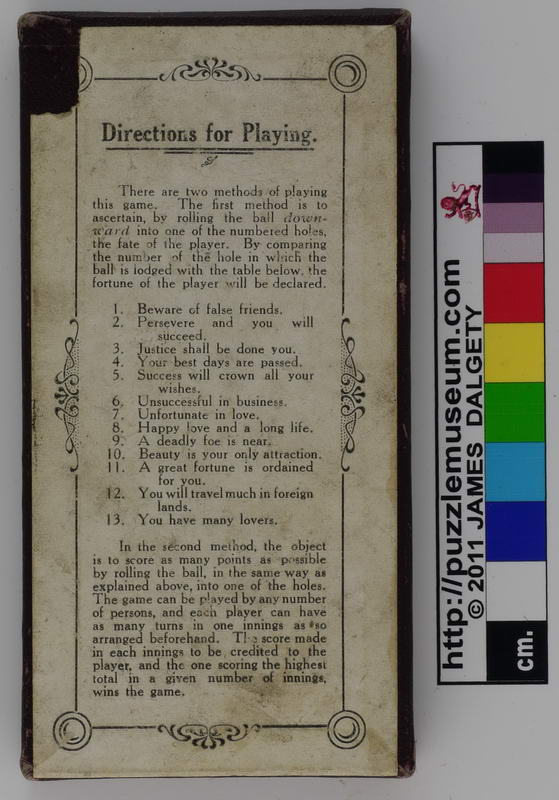 TWIN BEDS. A great and unusual dexterity. Unusual for any dexterity, the puzzle has to end up on edge with the correct weighted celluloid dolls lying down in the correct beds. Needs brains as well as dexterity. Made c1930 by Wilder Mfg.Co. USA (dup of N286) |