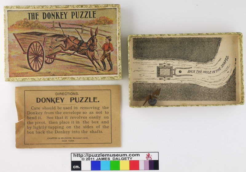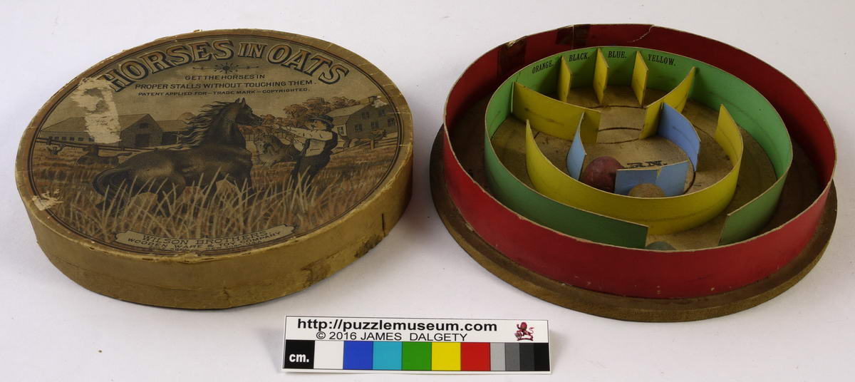 | HORSES-IN-OATS. One of the iconic early puzzles that followed on from the Crandall's Pigs in Clover craze of 1889. This example needs lots of TLC | Dx142 | sold | ||