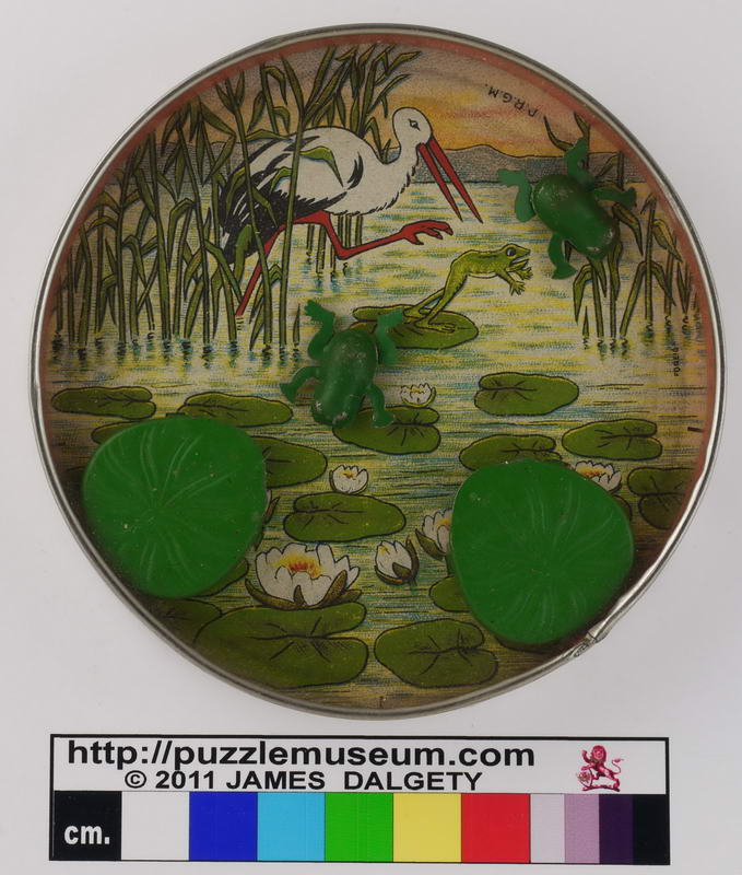 One of the most charming dexterities. Get the tin frogs with wriggling legs inder the tin water-lily leaves |