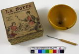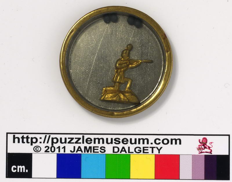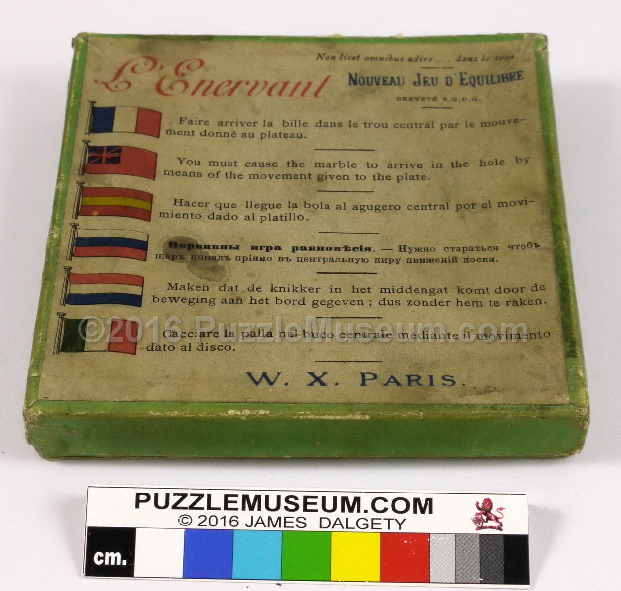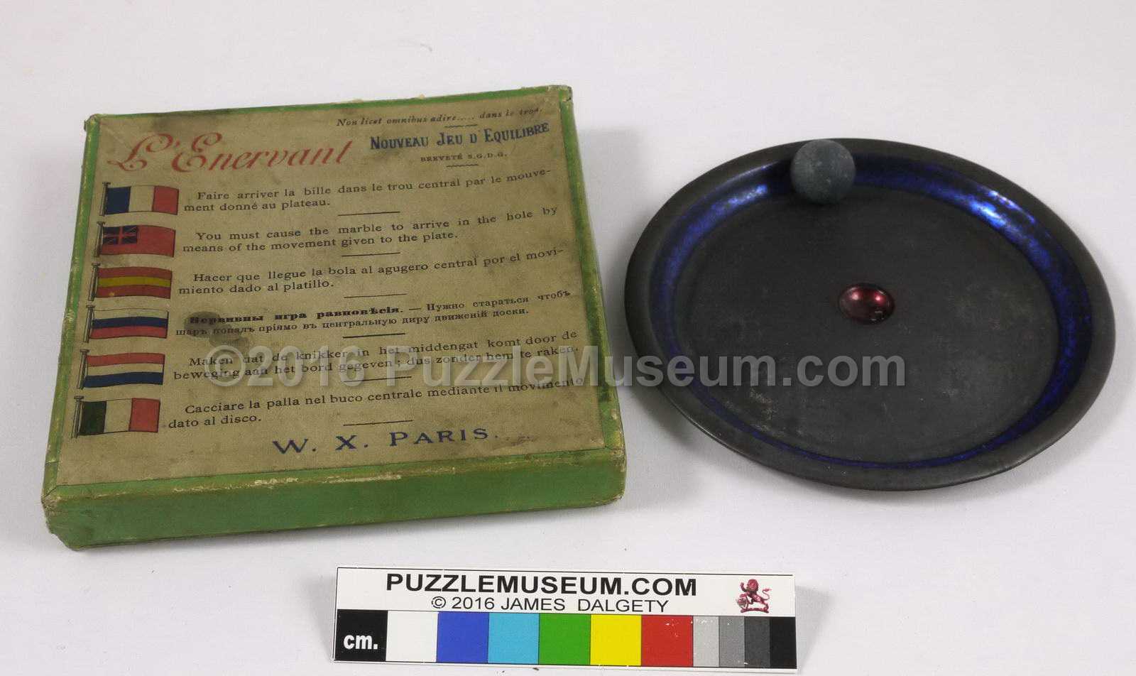 L'ENERVANT or GAME OF EQULIBRUM. Metal plate, clay ball, original box by Watilliaux, Paris.c1890. See Hoffmann Chap1 Puzzle 8. |