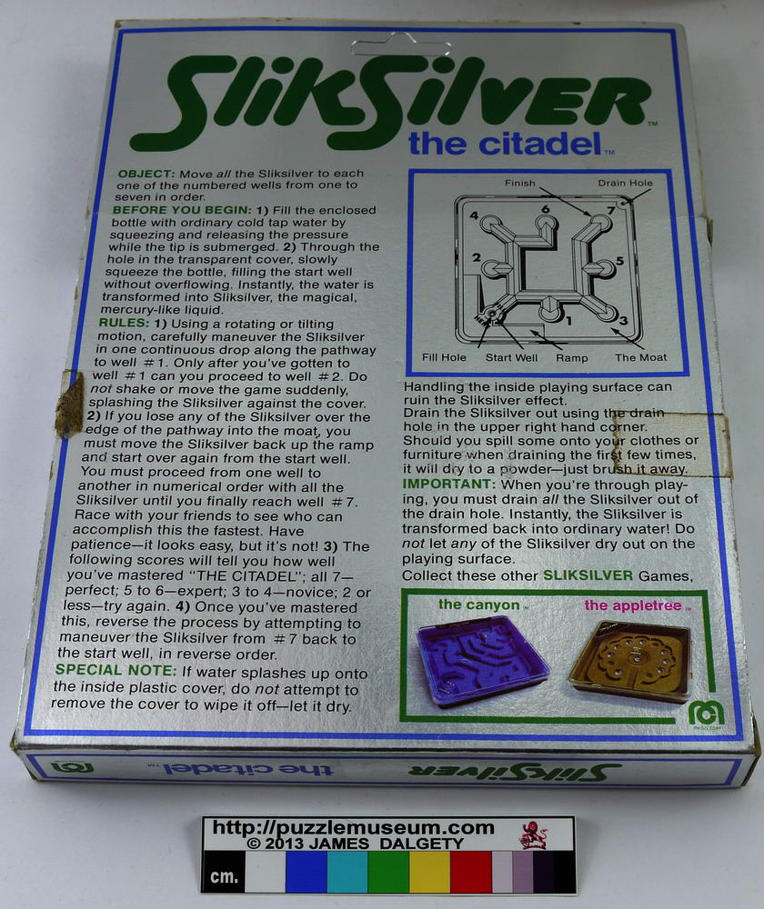 SLIK-SILVER. THE CANYON in wrong box but complete with instructions and water-dropper. Delightfule dexterity maze has a water-phobic coating so you put a drop of water in it and it behaves like quick-silver. |