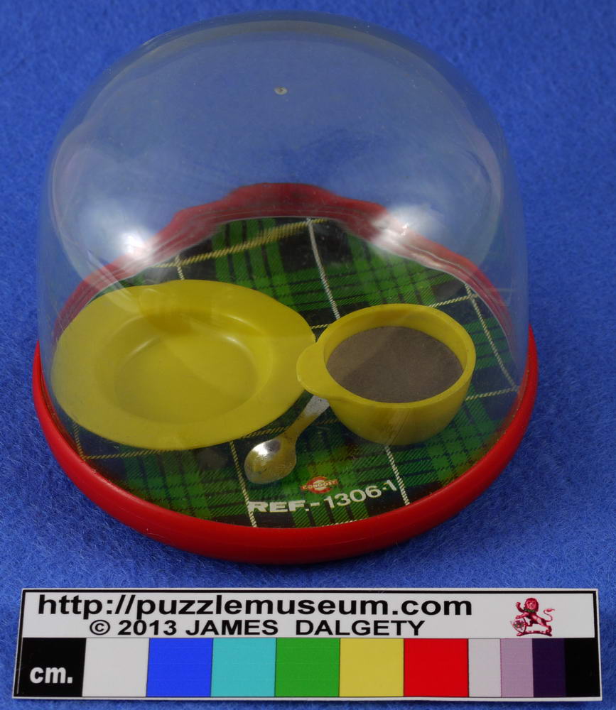 Get the Cup and teaspoon onto the saucer. Not easy as the magnet in the cup interferes with the teaspoon. One of the great Spanish Los Impossibles Designs of the 1970s. |