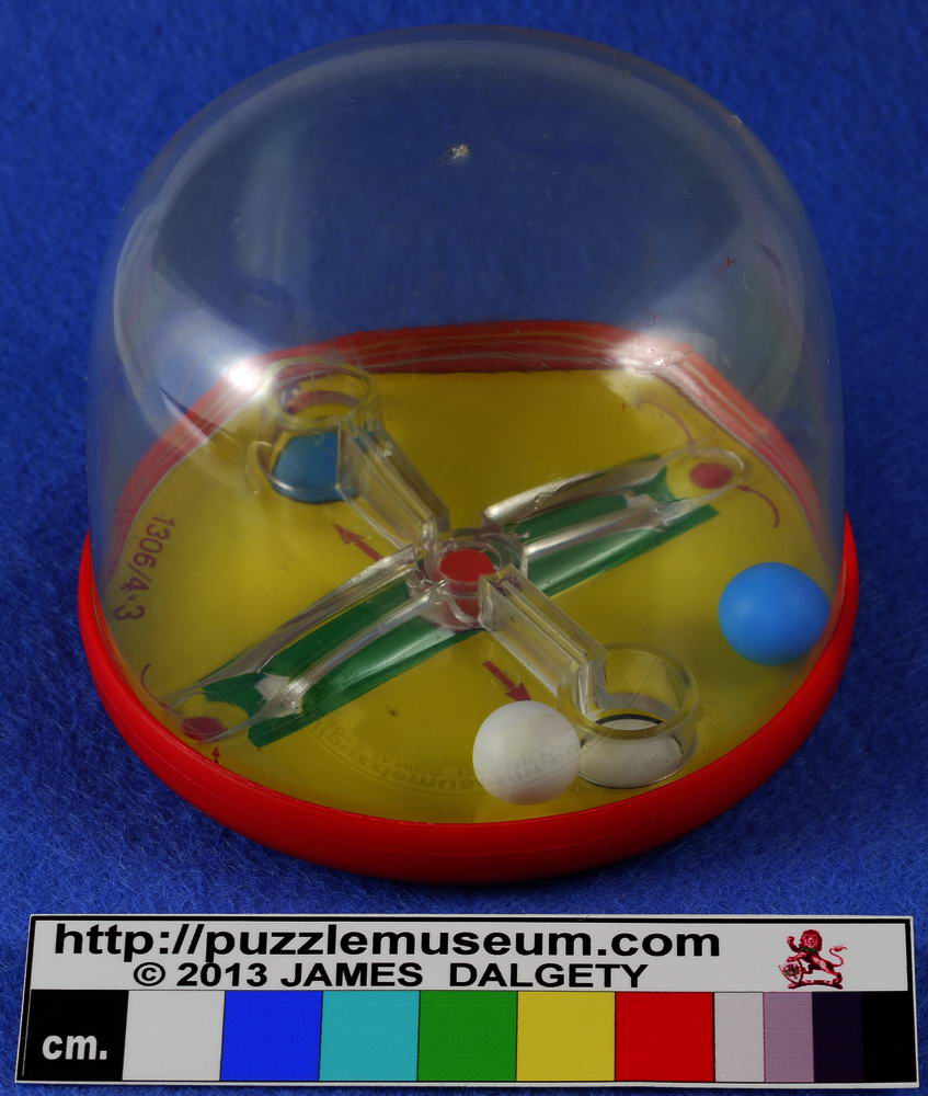 Roll the balls to top of ramp then press button underneath to send to to its correct destination. One of the great Spanish Los Impossibles Designs of the 1970s. |