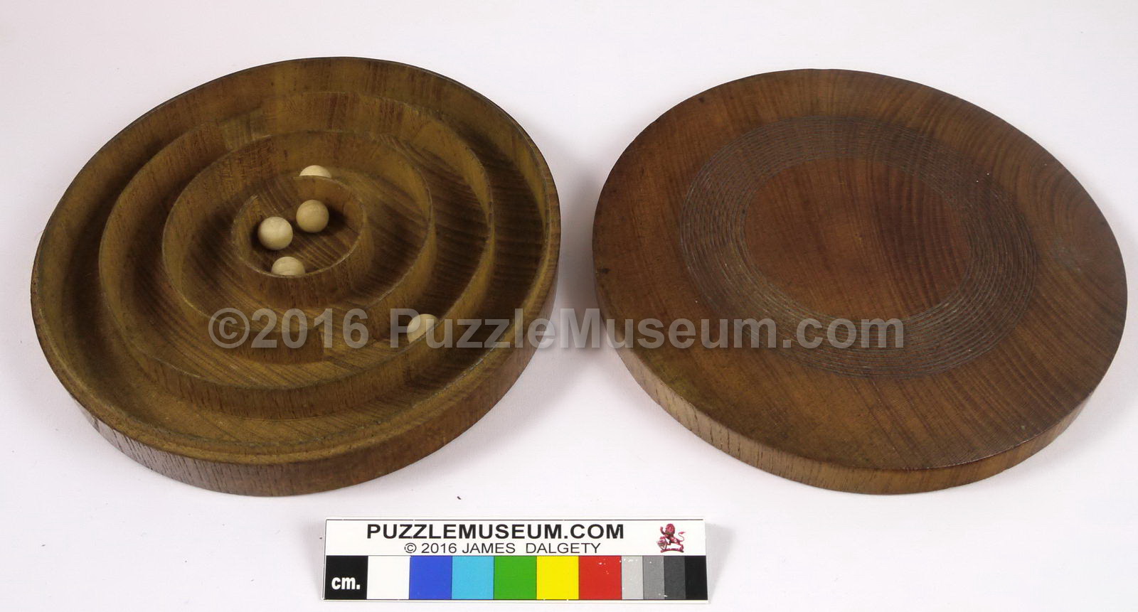 PIGS IN CLOVER. This appears to be an earlier perhaps 19th Century version. Unusually large 148mm (5.8 inches) diameter. Very fine turning. Inner walls only about 1mm thick and 14mm high from the same piece of wood as the base (no glue just solid!) |
