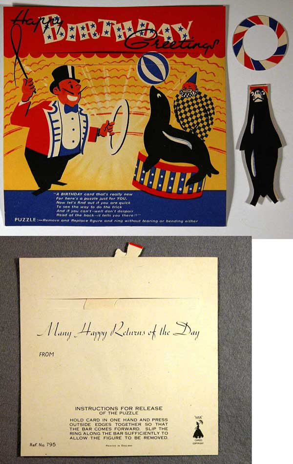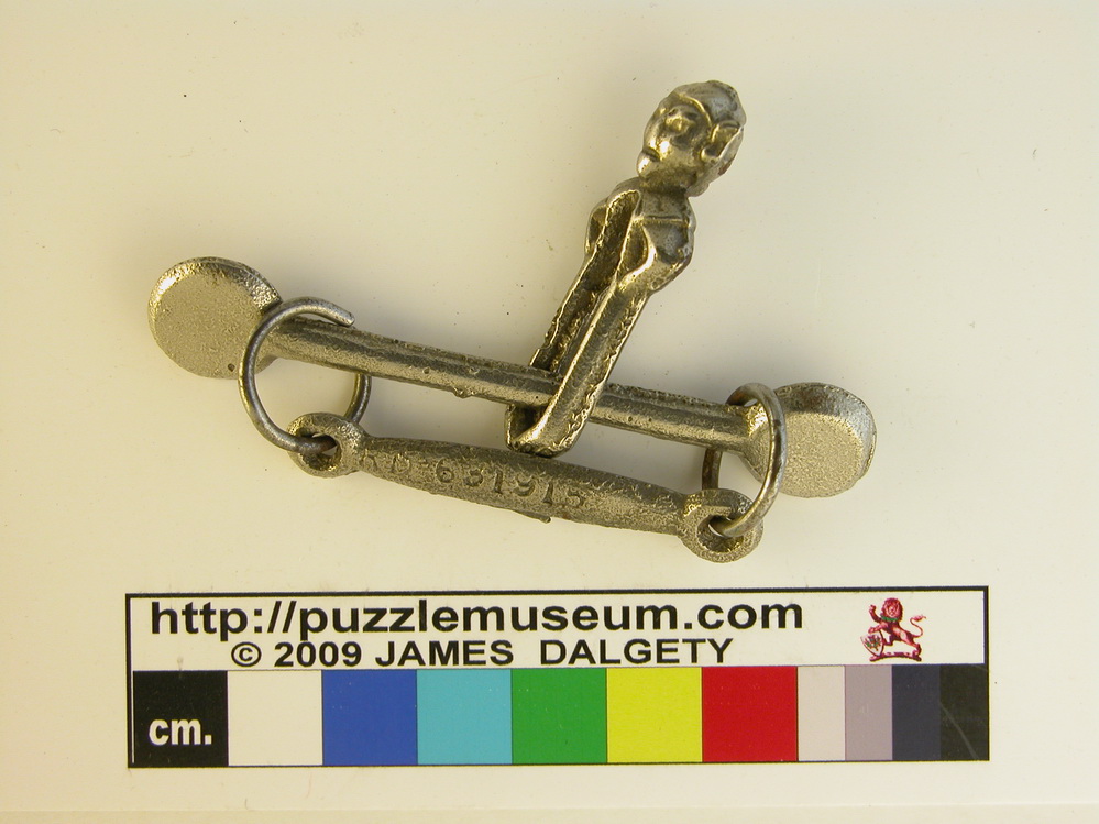 Cast Iron JOLLY NIGGER & PICK-IT-OUT puzzle. c.1900. Leaflet is a copy. String has been replaced. New ball bearing for the Pick-it-Out dexterity puzzle. Put the figure on the table then pick the ball out without moving the figure. |