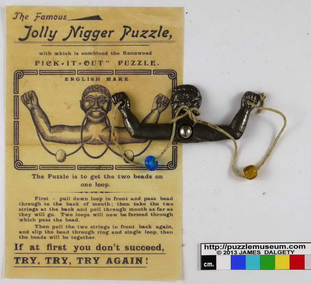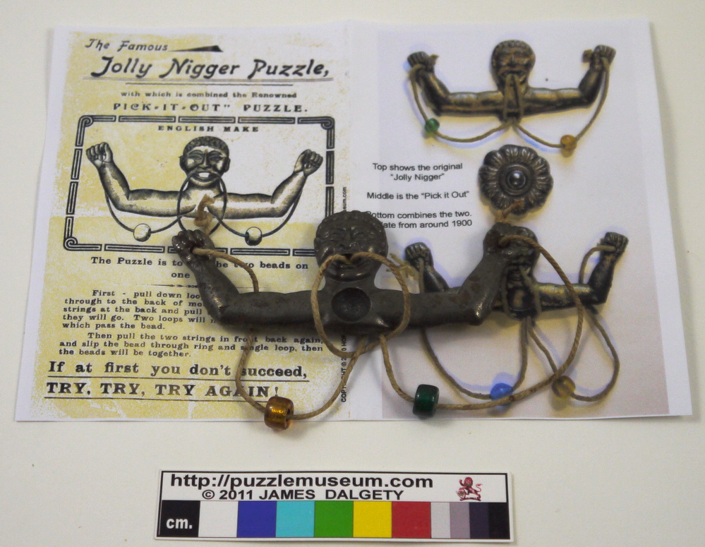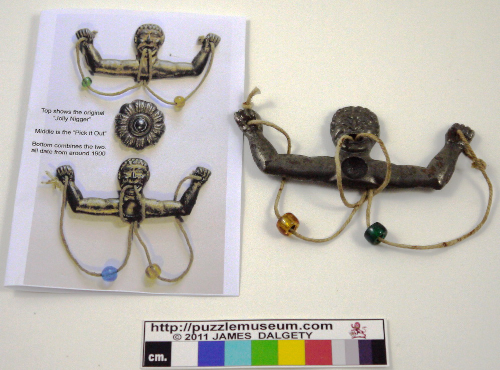 Cast Iron JOLLY NIGGER & PICK-IT-OUT puzzle. c.1900. Leaflet is a copy. String has been replaced. New ball bearing for the Pick-it-Out dexterity puzzle |